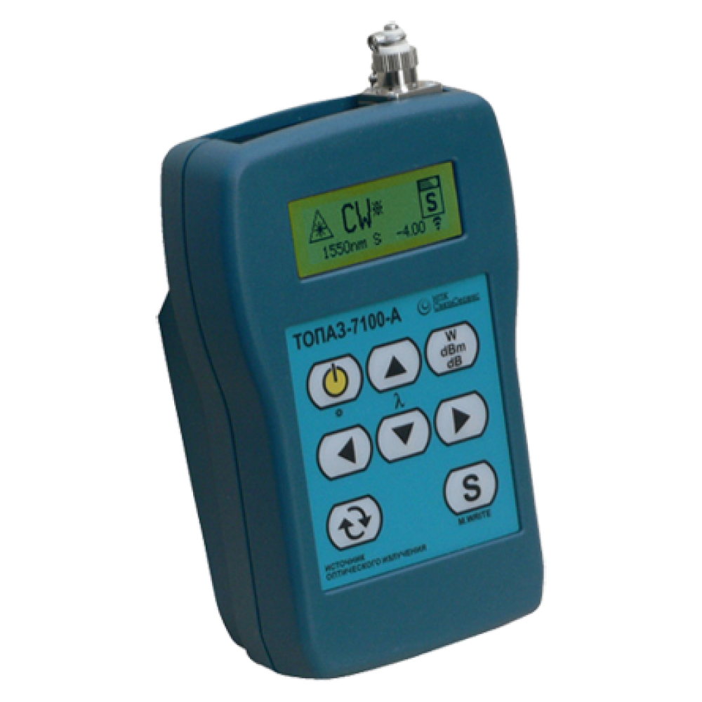 Приборы серии ТОПАЗ-7100-A – это удобные, компактные и профессиональные источники излучения. являются универсальным средством для тестирования и паспортизации оптических линий связи всех типов, в том числе PON, CWDM, DWDM и др. Приборы выпускаются в различных конфигурациях: одномодовые и многомодовые длины волн. На одном выходе может быть до трёх источников излучения. В приборе реализован режим переключения длин волн с передачей информации о текущей длине волны (CW*). Это используются в комплекте с измерителями оптической мощности ТОПАЗ-7200-А для автоматического измерения параметров волоконно-оптических линий связи (ВОЛС). Приборы зарегистрированы в Государственном реестре средств измерений гражданского и военного назначения.