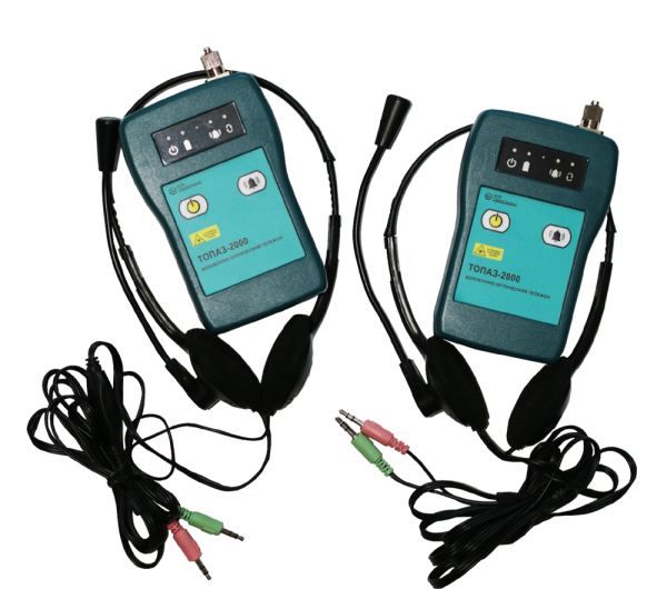 - Комплект состоит из двух полукомплектов - ТОПАЗ-2000-1 и ТОПАЗ-2000-2 - в каждый из которых входит модуль оптического телефона и телефонная гарнитура