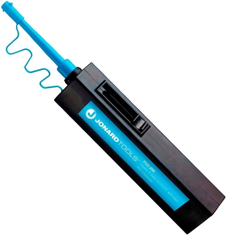 Очиститель оптических коннекторов SC, FC, ST обеспечивает исключительные характеристики, благодаря глубокой очистке разъема не только в критических точках возле волновода, но и поверхности коннектора далеко за ее пределами. Устройство можно использовать для чистки коннекторов SC, FC, ST ("папа") и портов SC, FC, ST ("мама"). Для смены этих режимов, достаточно снять наконечник-адаптер с носика очистителя. Пылезащитная крышка на наконечнике защищает чистящую ткань от загрязнений при хранении. Jonard FCC-250 имеет запатентованный поворотный на 360 градусов наконечник для более широкой очистки. Специальный механизм, позволяет выдвигать носик устройства на дополнительные 38 мм (1.5 дюйма), при этом его общая длина будет 10 см (4 дюйма). Это поможет добраться к порту в трудно доступных местах, например при большом количестве патч-кордов на патч-панеле. Fiber Connector Cleaner использует нетканую микро-волоконную ленту, которая не содержит ворса. Благодаря более широкому чистящему элементу, для хорошей очистки коннектора достаточно одного нажатия. Jonard FCC-250 обеспечивает более 800 чисток.
