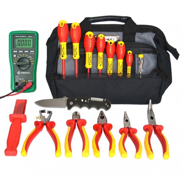 В состав набора входит профессиональный мультиметр Greenlee DM-45 и нож электрика для резки и зачистки провода.