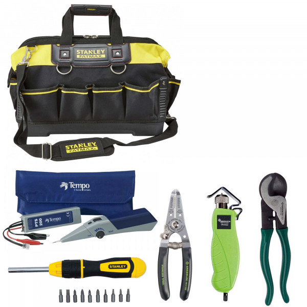 Набор инструментов кабельщика SK-17 (базовый) компании «СвязьКомплект». Набор предназначен для отбора нужного кабеля из пучка (с помощью тонального генератора и индуктивного щупа), резки кабеля, снятия изоляции внешней изоляции, зачистки проводников, сборки/разборки небольших конструкций. Состоит из 6 предметов включая влагозащищенную прочную сумку с прорезиненным дном.