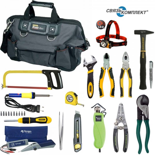 Набор инструментов кабельщика-спайщика SK-17-prof (полный) предназначен для работы с кабельными линиями. Он будет полезен для отбора нужного кабеля из пучка (с помощью тонального генератора и индуктивного щупа), резки кабеля, снятия внешней изоляции, зачистки и пайки проводников, сборки и разборки небольших конструкций, строительных и слесарных работ. В комплект входит ударопрочный водонепроницаемый фонарь с креплением на голову или каску. Весь инструмент уложен во влагозащищенную прочную сумку с прорезиненным дном.