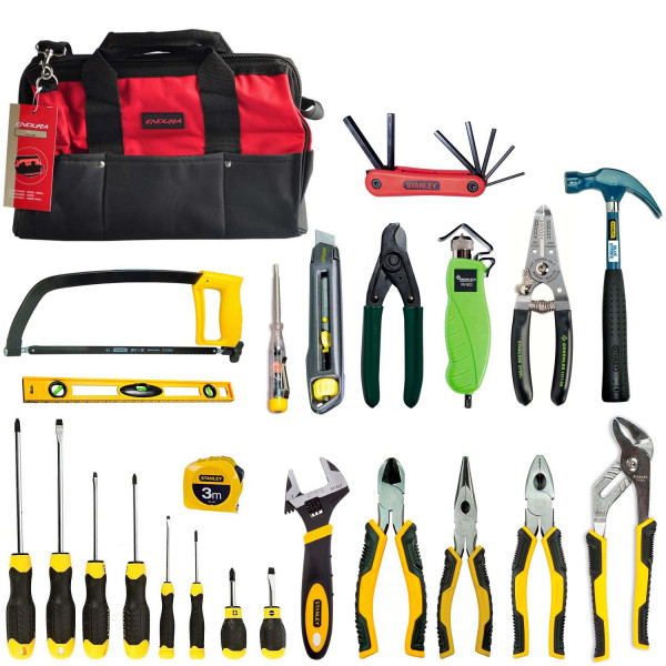 SK-24-2 - универсальный набор инструмента в сумке. Предназначен для разделки внешней изоляции кабеля диаметром до 25 мм, зачистки проводников, выполнения монтажных и строительных работ, сборки и разборки различных конструкций. Комплектуется профессиональным инструментом известных торговых марок. Поставляется в сумке из ткани "Oxford". Габариты 430 x 220 x 260 мм. Примерный вес набора 5 кг.