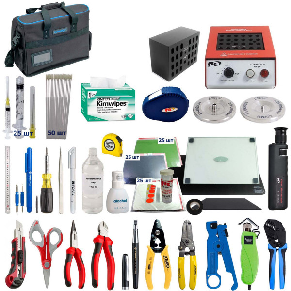 Назначение набора инструментов: разделка оптического кабеля, подготовка волокна к сварке, установка, полировка, визуальный контроль полировки и чистка клеевых оптических коннекторов FC, SC, ST, LC. Включает печь для термофиксации на 24 коннектора FC, SC, ST и LC.
