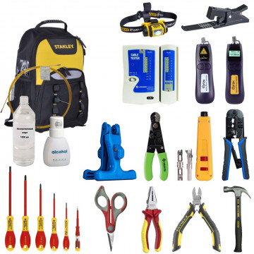 Комплект подобран реальными специалистами, работающими в области телекоммуникаций и систем связи. Он содержит инструмент для разделки обычного и плоского оптического кабеля, зачистки волокон от защитного лака, скалывания перед сваркой (либо установкой квази разъемных механических соединителей Fiberlock, клеевых коннекторов). Измеритель оптической мощности позволит измерить уровень сигнала, а локатор повреждений (красный свет) - просветить волокно для его идентификации на патч панеле, или с целью поиска макроизгибов. Для работы с кабелем связи типа витая пара предусмотрен опрессовочный инструмент для обжима модульных разъемов RJ 45, 11/12 и тестер для проверки правильности их установки. Ударный инструмент для расшивки кабеля на кросс позволит забивать проводники на плинты типа KRONE и 110. Также в наборе есть изолированные пассатижи и отвертки, кусачки, ножницы с серрейторным лезвием для кевларовых нитей или медного провода и налобный светодиодный фонарь. Для транспортировки инструмента предусмотрен специальный рюкзак Stanley с органайзером, 34 х 44 х 16 см, нагрузка до 15 кг.