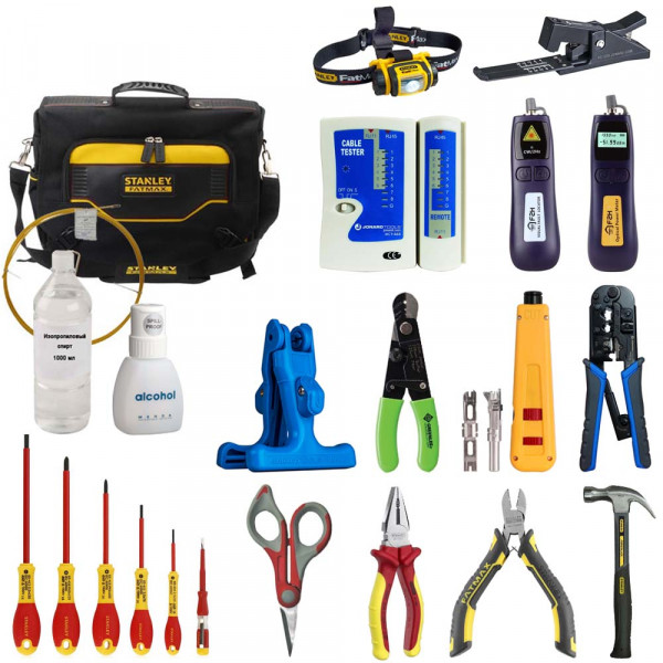 Комплект подобран реальными специалистами, работающими в области телекоммуникаций и систем связи. Он содержит инструмент для разделки обычного и плоского оптического кабеля, зачистки волокон от защитного лака, скалывания перед сваркой (либо установкой квази разъемных механических соединителей Fiberlock, клеевых коннекторов). Измеритель оптической мощности позволит измерить уровень сигнала, а локатор повреждений (красный свет) - просветить волокно для его идентификации на патч панеле, или с целью поиска макроизгибов. Для работы с кабелем связи типа витая пара предусмотрен опрессовочный инструмент для обжима модульных разъемов RJ 45, 11/12 и тестер для проверки правильности их установки. Ударный инструмент для расшивки кабеля на кросс позволит забивать проводники на плинты типа KRONE и 110. Также в наборе есть изолированные пассатижи и отвертки, кусачки, ножницы с серрейторным лезвием для кевларовых нитей или медного провода и налобный светодиодный фонарь. Для транспортировки инструмента предусмотрена сумка - органайзер Stanley.