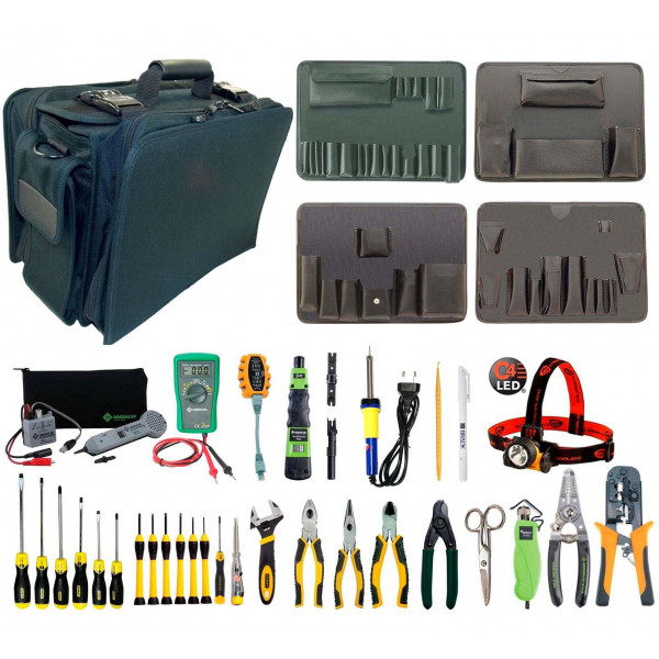 SK-V-1267 - набор инструментов в сумке Jensen из особо прочного тройного баллистического нейлона. Инструмент располагается на четырех съемных паллетах, закрепляемых внутри сумки. С помощью этого набора можно производить монтаж/демонтаж небольших конструкций, резать и разделывать медный кабель, оконечивать витую пару модульными разъемами RJ45, расшивать проводники на патч-панель или кросс 66/110. Также набор включает профессиональный мультиметр для измерения напряжения, частоты, тестирования батарей и диодов. Тональный генератор с индуктивным щупом позволять трассировать нужный кабель, проверять его целостность и отбирать нужные проводники из пучка.