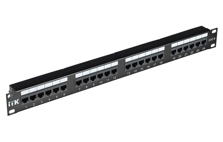 Представляет собой панель с множеством соединительных разъёмов – розеток RJ-45, расположенных на лицевой стороне панели и врезными контактами, расположенными на тыльной стороне панели, предназначенными для фиксированного соединения с витопарными кабелями.