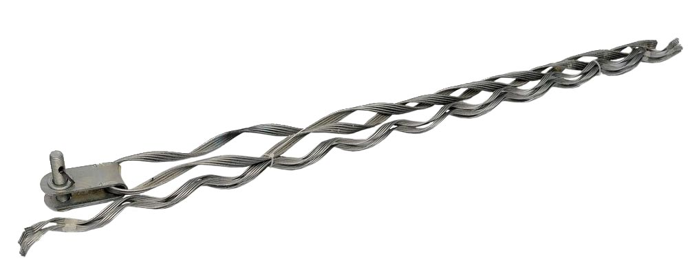 Зажим состоит из силовой части, которая представляет собой U-образную прядь из нескольких спиральных проволок, скрепленных между собой специальным раствором, с внутренней стороны которых нанесет абразив. Протектор для дополнительной защиты кабеля представляет собой комплект отдельных спиралей или склеенных прядей, навиваемых на поверхность провода.