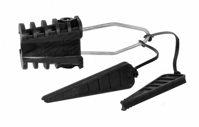 Изготавливается из прочных полимеров и стали горячей оцинковки, устойчивых к ультрафиолету и атмосферным воздействиям. При закреплении двух проводов в зажиме, предназначенном для четырех, необходимо заклинить второй клин в его гнезде.