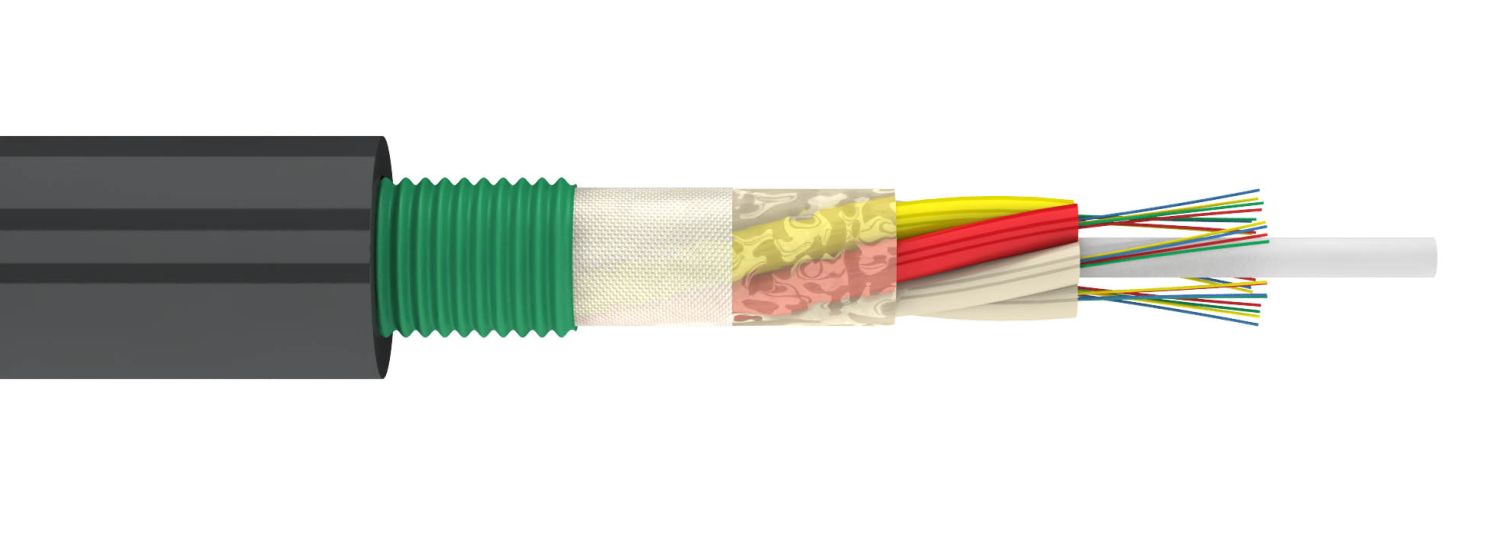 Конструктивно представляет собой повив оптических модулей вокруг стеклопластикового прутка защищенного стальной гофрированной лентой и наружной оболочкой из полиэтилена средней плотности. Свободное пространство в оптических модулях и в сердечнике кабеля заполнено гидрофобным гелем. На сердечник продольно накладывается водоблокирующая лента.
